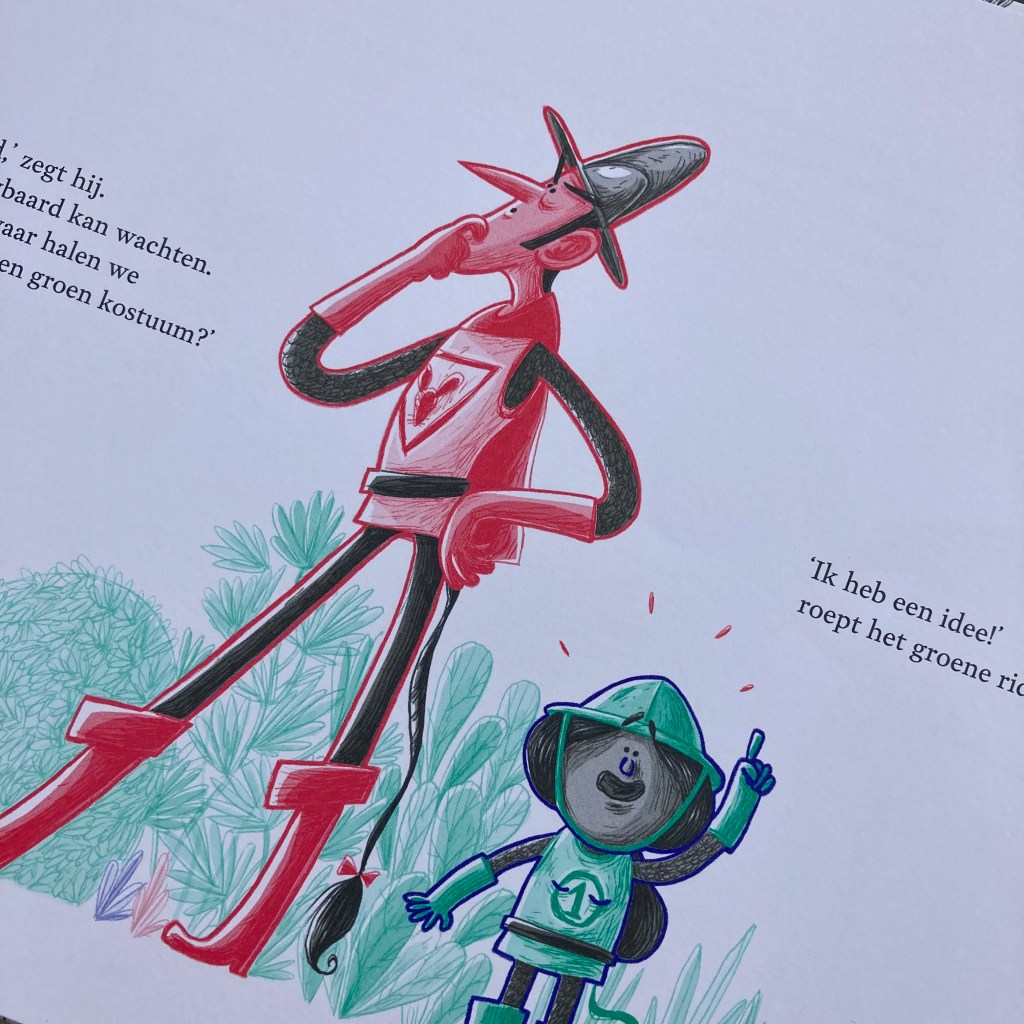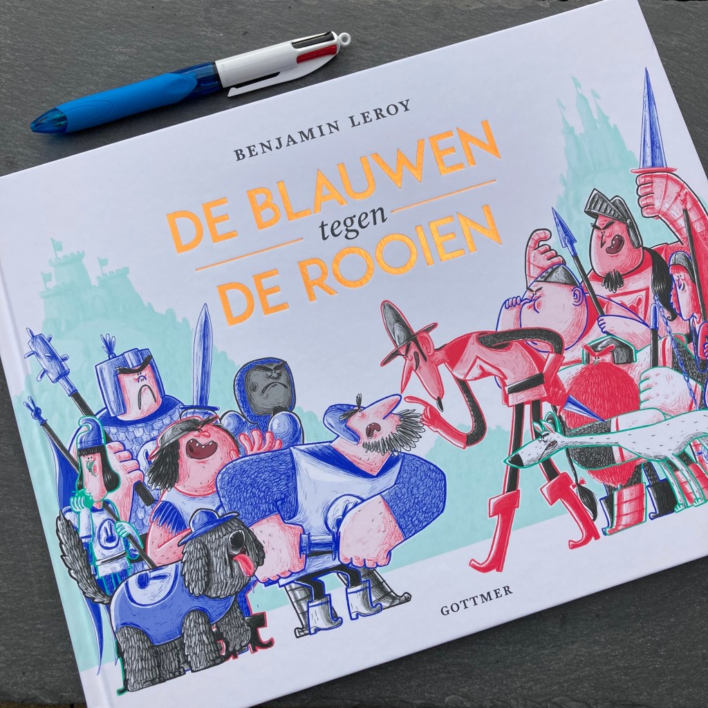 Iedereen heeft wel eens met een bic getekend, tijdens een les die niet kon boeien of tijdens een ellenlange vergadering, maar wat Benjamin Leroy met zijn bic presteerde is van een ander niveau. Voor het eerst schreef hij ook de teksten bij zijn illustraties en het resultaat is het wondermooie “De blauwen tegen de rooien”. Een verrassend en origineel prentenboek over stoere en minder stoere ridders, ridderjongens en riddermeisjes, over vijanden die vrienden worden (of toch niet?) en over het kind in jezelf loslaten. De kleuren van de illustraties spatten van het papier en wie in detail de prenten bestudeert, ontdekt elke keer iets nieuws. Een tijdloos prentenboek dat het verdient om een plaatsje te krijgen in elke boekenkast of bibliotheek zodat het door deze en volgende generaties stukgelezen kan worden.