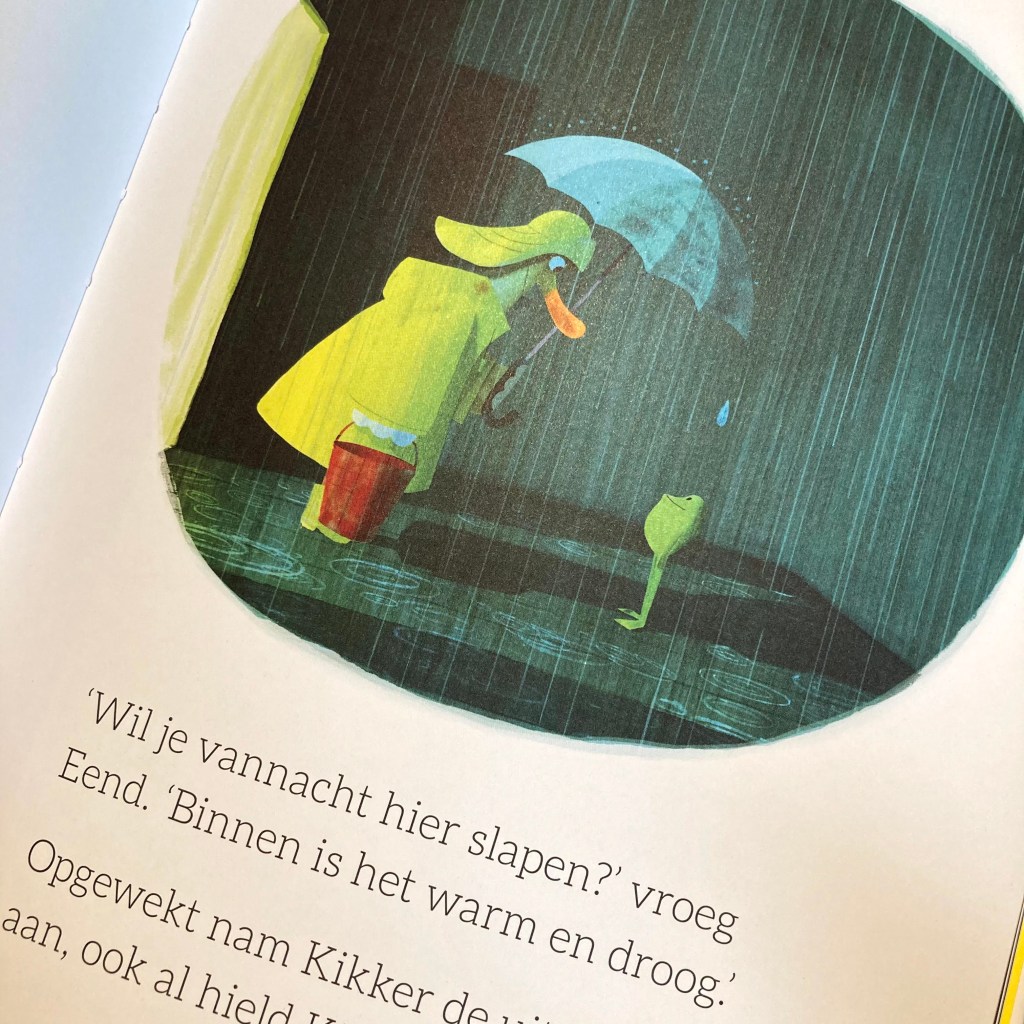 Eend houdt niet van water, dus ook niet van zwemmen, peddelen of regen. Als het regent zit hij liefst in zijn in een lekkere stoel, met een goed boek en een warme kop thee. Als het op een nacht binnen regent in zijn huisje gaat hij op zoek naar een oplossing en ontmoet hij kikker die verdwaald is. Kikker mag bij eend logeren en ze hebben een leuke tijd. De volgende dag gaan ze op zoek naar het huis van kikker. Eens terug thuis vindt eend het niet meer zo leuk alleen in zijn huisje…