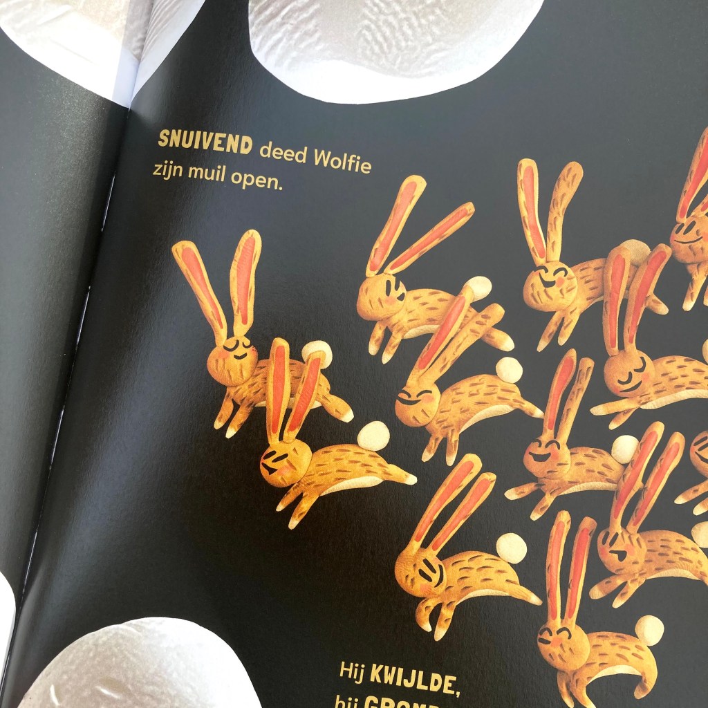 Wolfie is een hongerig wolfje en verandert in een monstertje als hij snel eten vindt. Het eerder donker prentenboek wekt eerst de indruk dat het verhaal misschien wat griezelig zou kunnen zijn. Niet is minder waar! Wolfie is eigenlijk een gewoon, lief wolfje die toevallig grote honger heet. Wat er gebeurt als hij uiteindelijk de konijntjes vindt, moet je beslist zelf lezen. Ik kan je echter verzekeren dat dit verhaal vooral erg grappig en herkenbaar is voor kinderen die ook wel eens in monstertjes veranderen als ze honger hebben. Een grappig, herkenbaar en origineel prentenboek dat zich uitstekend leent om luidop voor te lezen aan kleine monstertjes vanaf 4 jaar!
