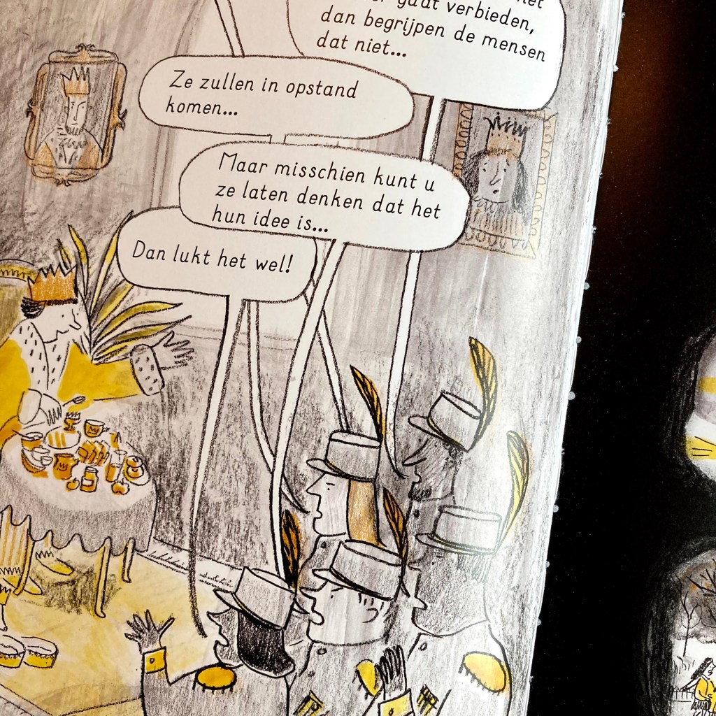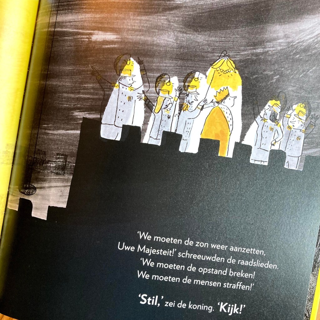 Dit prentenboek geschreven en geïllustreerd door Emily Haworth-Booth is haar debuut waarmee ze voor verschillende prijzen genomineerd werd. De illustraties in tinten zwart, geel en wit creëren een bijzondere sfeer. Dit verhaal met een sterke en diepe boodschap kan aan kinderen van heel uiteenlopende leeftijden verteld worden. Jonge kinderen zullen het bang zijn (in het donker) ongetwijfeld herkennen en de rest van het verhaal als grappig ervaren, terwijl oudere kinderen zullen kunnen nadenken over het belang van licht en donker en de invloed van politiek. Dit bijzondere prentenboek is een echte aanrader die een mooie boodschap combineert met artistieke illustraties vol kleine details.