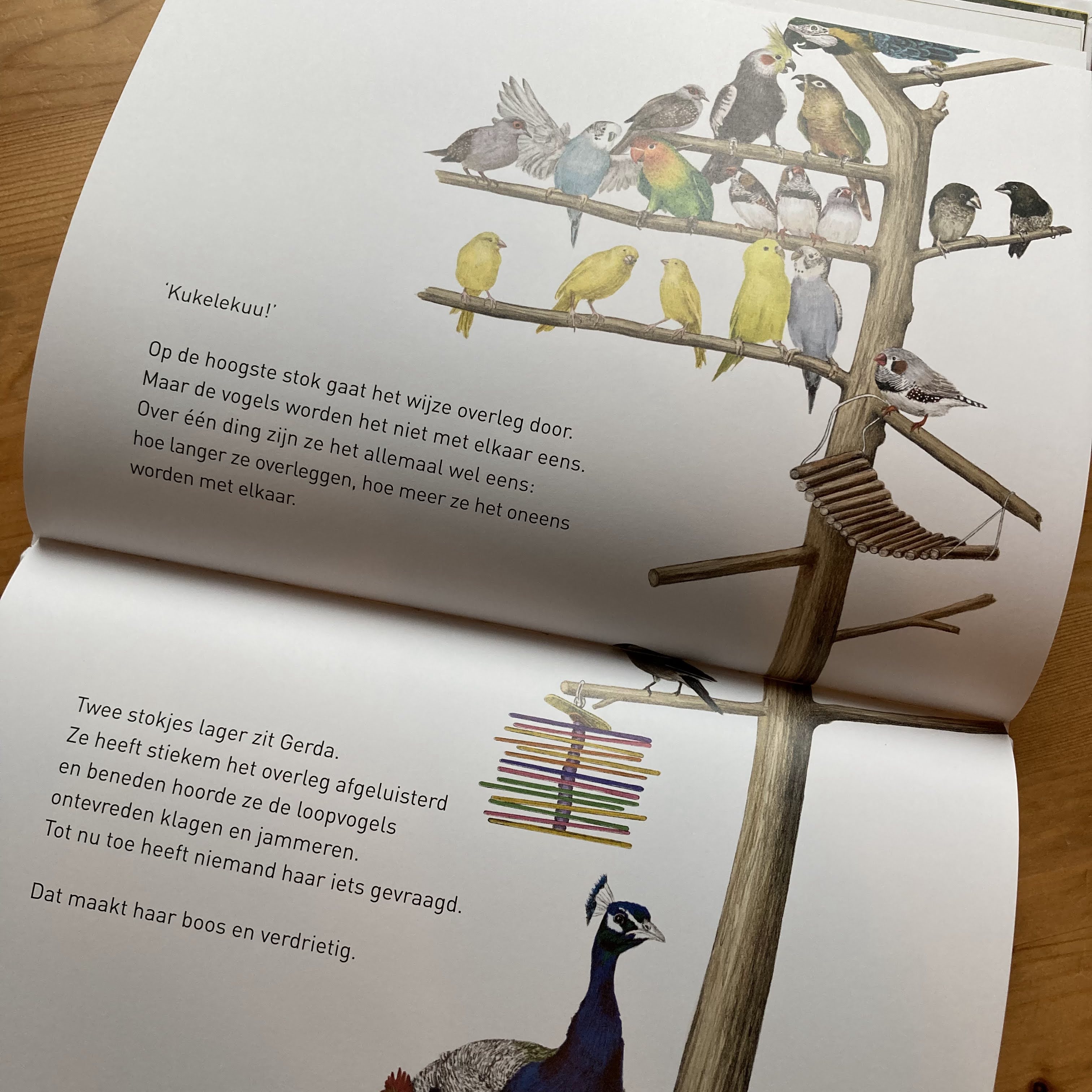 Als Gijs overlijdt, blijven de vogels in zijn volière alleen achter. Het zaad wordt niet meer bijgevuld en het water niet meer ververst. Het zorgt ervoor dat de vogels wat bang worden en ze besluiten te overleggen. Enkel de wijze vogels mogen hieraan deelnemen, dat is meestal de oudste van een bepaalde vogelsoort. De loopvogels mogen niet deelnemen, want kunnen niet bij het hoogste stokje. De wijze vogels raken het echter niet eens. Gelukkig heeft Gerda de goudvink een idee.