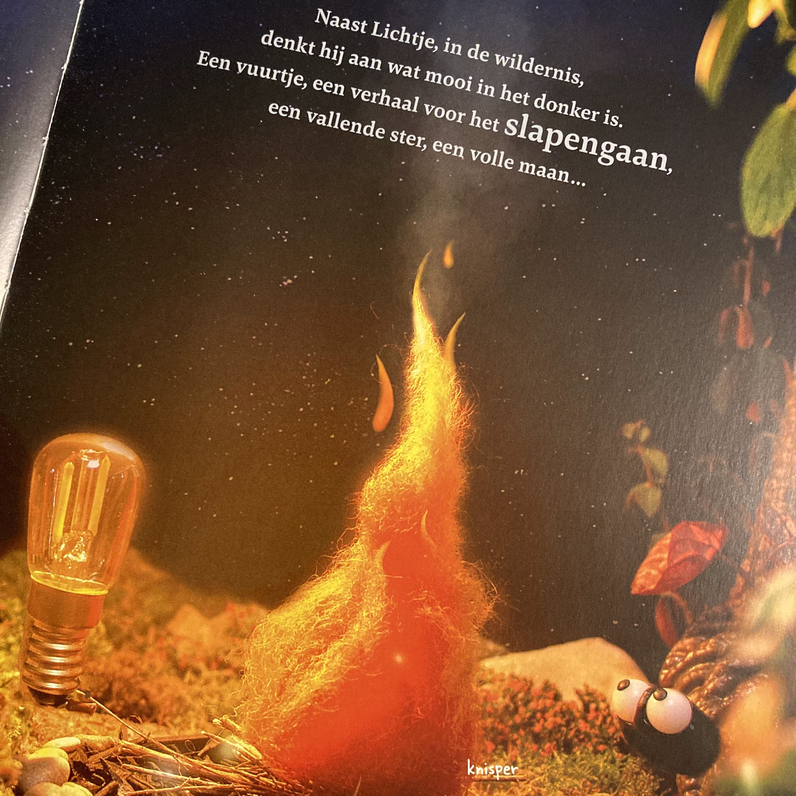 Dit is het debuut van Marit Kok. Wat startte als een idee voor een kortfilm groeide uit tot een bijzonder prentenboek waarvoor Marit in haar studio het decor met de hand creëerde. Deze gedetailleerde decors werden gemaakt met een hele resem materialen, van klei tot hout, over plantjes en steentjes tot takjes. Het resultaat is een bijzonder warm en sfeervol prentenboek dat ouders en opvoeders ertoe aanzet met kinderen over de nacht in gesprek te gaan. Het is een kans om angsten te overwinnen en het moois wat de nacht te bieden heeft te tonen. Het fijne verhaal op rijm maakt het plaatje compleet. Marit Kok bewijst met dit debuut dat ze heel wat in haar mars heeft en doet absoluut smaken naar meer. Een origineel, sfeervol prentenboek dat vertrouwen zal geven aan kinderen die bang zijn in het donker.