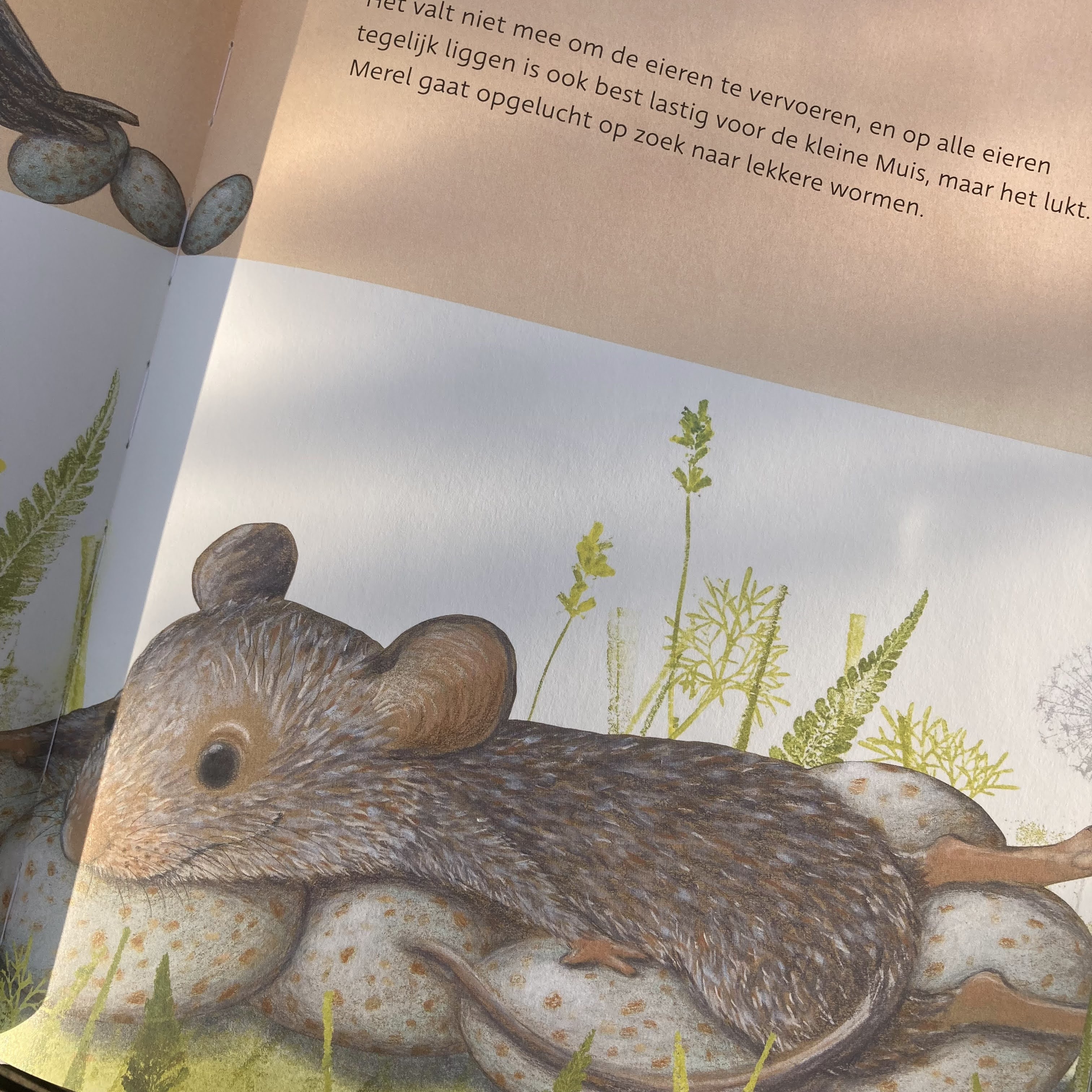 Het Zwitserse duo, Lorenz Pauli en Kathrin Schärer, werkt vaak samen aan prentenboeken met dieren in de hoofdrol. De behulpzame Muis biedt aan om voor Merel op te passen en heeft in een oogwenk meer dieren en eieren dan ze onder haar hoede kan nemen. Maar dat oppassen doet ze met verve en hoewel de dieren verlangen om terug naar hun moeders te gaan, hebben ze toch verdriet als ze afscheid moeten nemen van Muis. Een fijn prentenboek met zachte illustraties in waarheidsgetrouwe natuurtinten dat kinderen die niet zo uitzien naar een oppas zal kunnen overtuigen dat een oppas echt wel leuk kan zijn. In de klas is het ook inzetbaar om over ouders, kinderen en tijdelijke zorgverleners te praten. Om samen met kinderen vanaf 3 jaar van te genieten.
