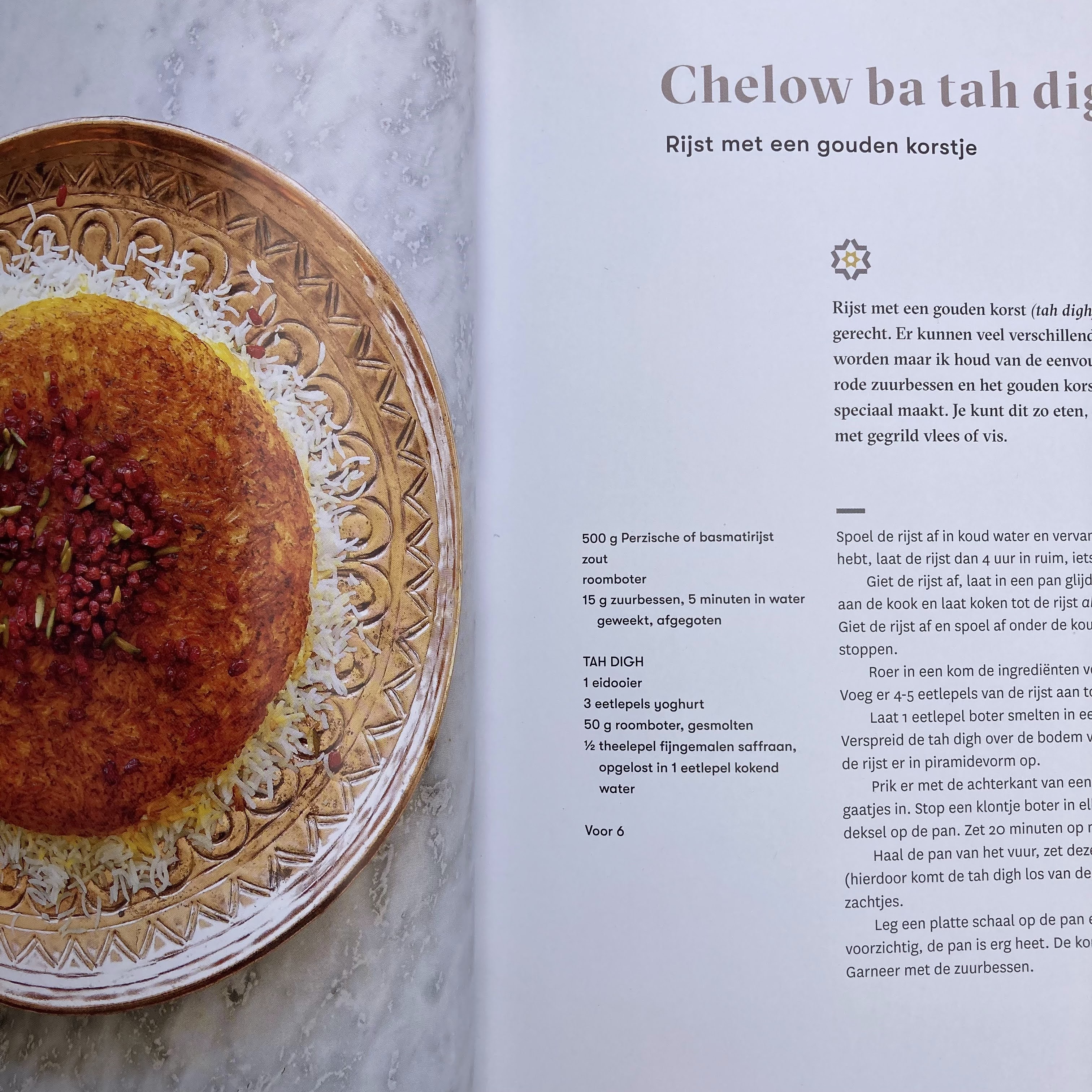 Dit boek doet je werkelijk verlangen naar de zon en de zomer, met gerechten boordevol groenten en specerijen. Heel wat gerechten zijn eenvoudig en op basis van eerlijke ingrediënten. Tuinbonen, aubergines, rijst en maast-e chikideh (uitgelekte yoghurt) en fenegriek komen vaak terug in de zonnige gerechten. Salades, perfect klaargemaakte rijst, de lekkerste dips op basis van groenten, maar ook stoofpotjes met vis of vlees zijn rijkelijke in dit boek aanwezig. Fijn is dat je naast de lekkere gerechten ook kennis maakt met een land dat voor velen echt onbekend is en die je na het lezen van dit boek toch met een andere blik zal bekijken. Wij probeerden hier de koofteh-rizeh (gehaktballetjes in pittige tomatensaus) en maakten rijst klaar op de perzische manier. Wat hebben we van deze gerechten gesmuld en genoten van de rijke, warme smaken! Dit boek zal zeker nog vaak door onze handen gaan om lekkere, verrassende gerechten uit te kiezen. En die perzische rijst, die is absoluut een blijver!
