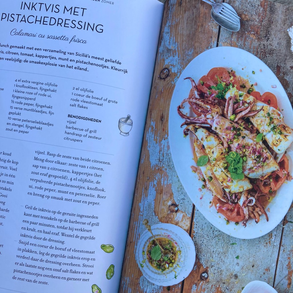 Laat je dus verleiden en verras je tafelgenoten met gerechten als geroosterde paprika met broodkruim, pasta alla Norma, heerlijke crostini of verfrissende citroendrankjes. Vele recepten laten je buiten de platgetreden paden gaan en verrassen door hun smaakvolle eenvoud. Mijn persoonlijke favoriet is ongetwijfeld de pasta met gepofte auberginepesto en amandelen, een zalige vegetarische pasta vol zomerse smaken. Voor wie geen zin heeft in pasta is er inktvis met pistachedressing of misschien waag je je graag eens aan de krokante aubergineballetjes. Heb je zin in een zoete afsluiter, dan zijn de cannoli met pistachenootjes of één van de granita’s misschien wel iets voor jou. Voor elk wat wils dus!