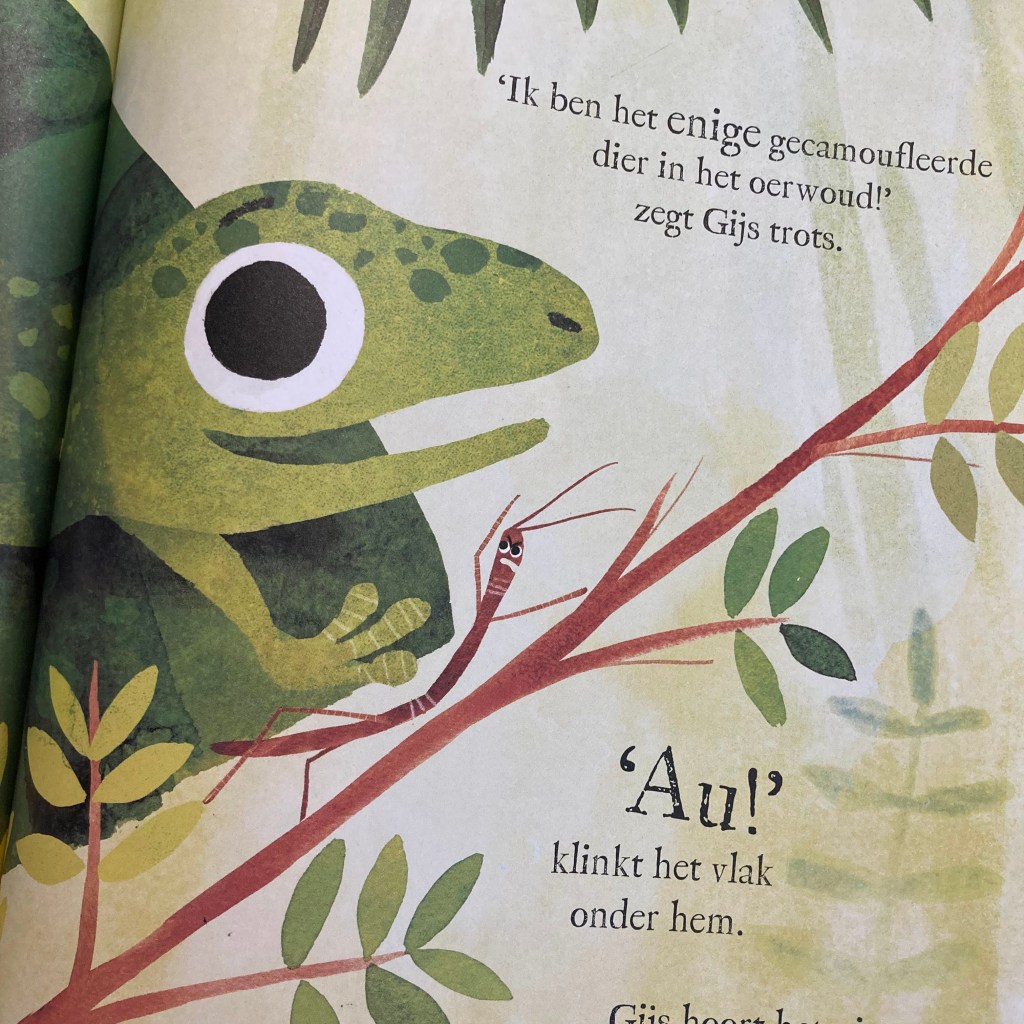 Gijs is een meester in camouflage. Hij is bijzonder trots en denkt dat hij de enige is die dat kan. Dan hoort hij een kikker, maar hij kan hem niet ontdekken. Ook andere dieren merkt hij helemaal niet op, zo vol van zichzelf is hij. Tot een wandelende tak hem erop wijst dat heel wat dieren zich kunnen camoufleren. Gijs is helemaal van de kaart en weet niet hoe het verder moet, nu hij maar heel gewoon lijkt te zijn… Dan ontmoet hij Gina, een andere gekko.