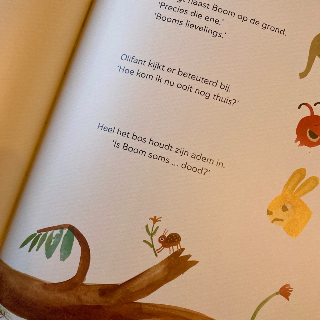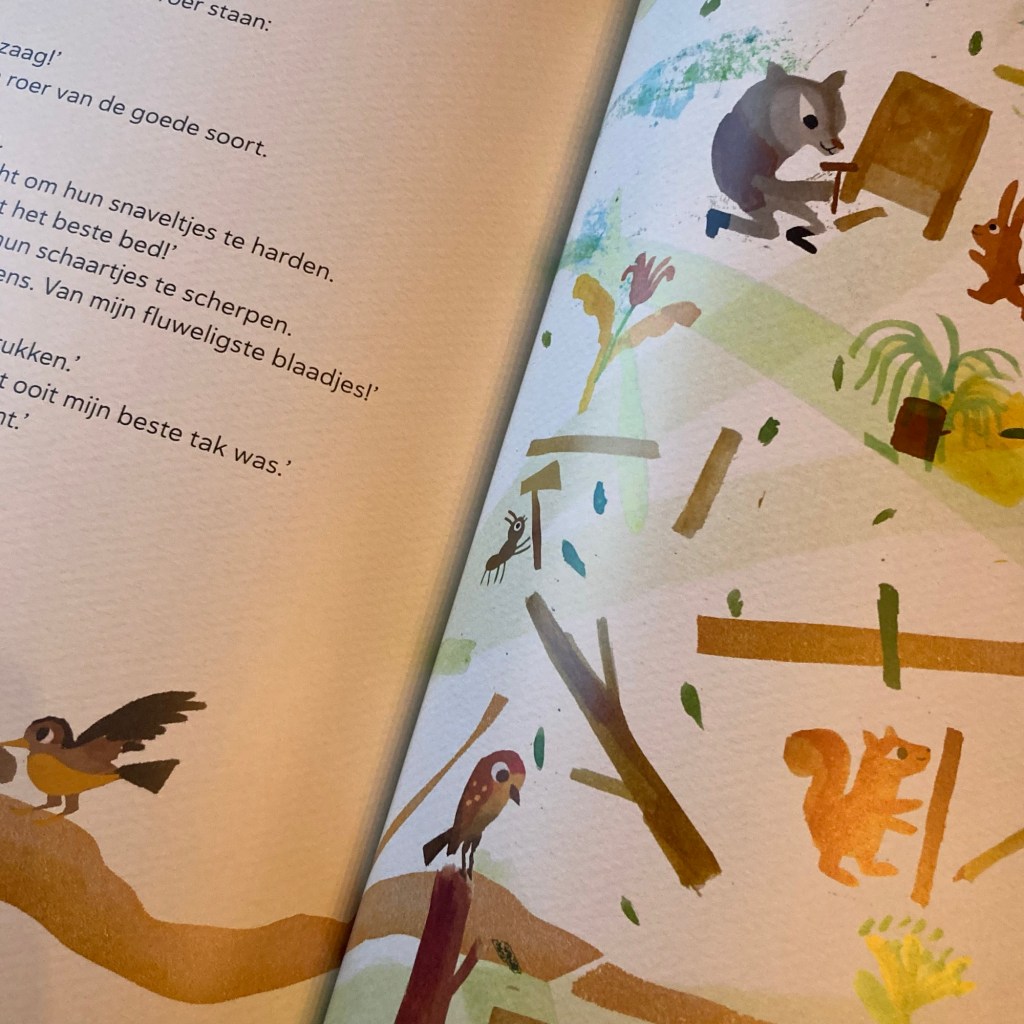 Kim Crabeels, Dieter De Schutter en Marc Herremans werkten samen aan dit bijzondere prentenboek voor kinderen vanaf een jaar of 6. Samen vertellen ze een hoopvol verhaal over verdergaan na een grote tegenslag. Met een stevige dosis humor en heel veel gevoel zetten ze een grote, fiere boom in de hoofdrol en beschrijven ze hoe hij, dankzij vrienden, steun en een stevige dosis moed, de kracht vindt om zijn leven anders maar minstens even zinvol verder te zetten. Tekst en illustraties vormen samen een krachtig geheel dat een ideale basis vormt om met kinderen in gesprek te gaan over tegenslag en hoe ermee om te gaan. Dit mooie prentenboek is een echte aanrader en een aanwinst voor je boekenkast thuis en in de klas. Het biedt vele uitwerkingsmogelijkheden en kan heel breed ingezet worden.