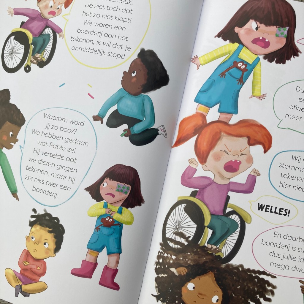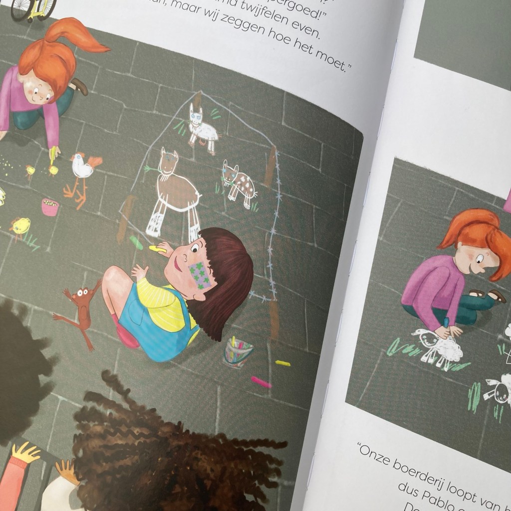 Wat is er leuker dan op een fijne vrije middag buiten te spelen en de buurt vol te zetten met stoepkrijttekeningen? Dat vinden ook Wilma en Pam die een heuse boerderij op de stoep tekenen. Als hun vrienden ook mee willen komen krijten, is er even twijfel, maar als ze zich aan de regels van het tweetal houden mogen ze meetekenen. Als Sky en Mo een levensgrote dino tekenen, loopt het mis, want dat past niet in het plan van Wilma en Pam. Er ontstaat een vlammende ruzie en verwijten worden heen en weer geslingerd. Tot de regen met bakken uit de lucht valt en hun tekeningen veranderen in kleurrijke plassen.